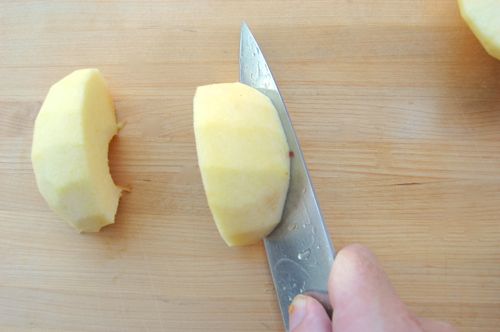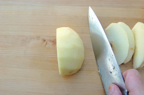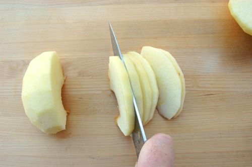 You’ll finish the cuts like so. Why do it this way? Because you’ll have consistent slices that cook up evenly. I should add here that some people like thicker slices, others like chunks. Just try to make them even whatever you decide on. One word of advice though, don’t make the slices too thin since even slices of firm apples can get mushy if they’re too skinny.