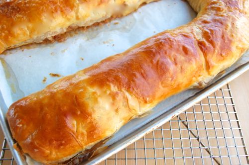 Bake at 400 for a total of about 40 minutes (check it and rotate it at 20 and 30 minutes to keep an eye on the progress). You want it nice and dark brown. The reason I recommend high heat is because you want to brown it reasonable quickly. If the filling gets very hot all the way through you’ll generate steam and the filling will burst out the sides. The high heat will brown the strudel without getting it too hot in the center.