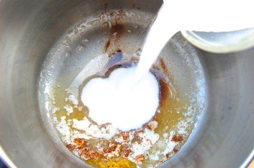Next, over medium heat melt the butter in a large pot or saucepan and add the sugar, zest and cinnamon.
