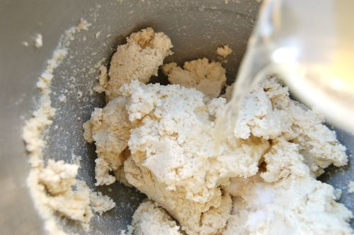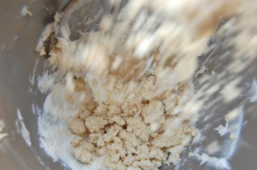 With everything ready, put the lard (or shortening) and baking powder into the bowl of a mixer fitted with the paddle (beater).