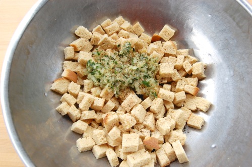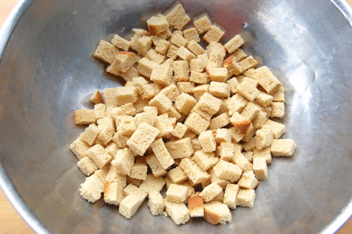 Assemble all your ingredients and set a pot of water on the boil. Here I have about nine ounces of completely stale wheat bread, cubed with most of the crusts trimmed off. You can dry fresh bread cubes out in a 200-250-degree Fahrenheit oven if you wish. It takes about 40 minutes. Try not to let them brown if you can help it. Anyway, pour them into a large bowl.