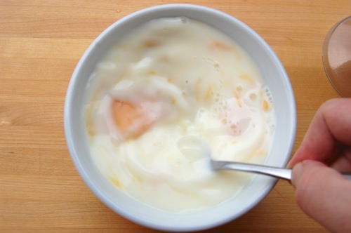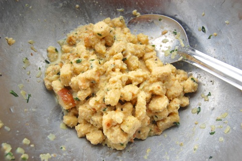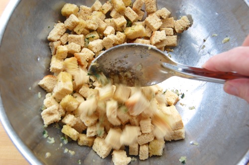 It’ll take about two minutes of tossing for the bread to soak up the egg mixture. Set that aside.