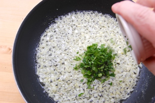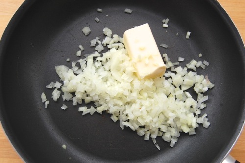 Next combine the mined onion and butter in a sauté pan. Sweat the onions over medium-low heat until they’re soft and translucent, but again, not browned.