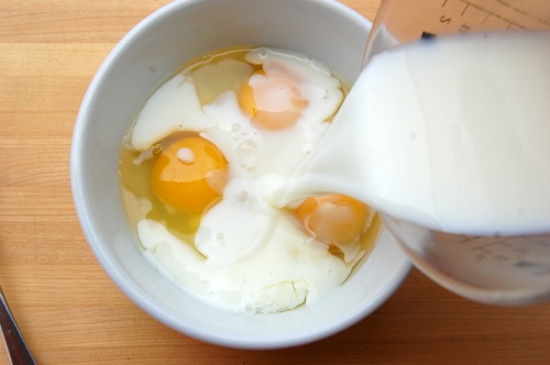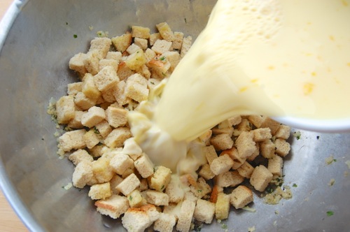 Pour that mixture over the bread cubes, then add the salt, pepper and nutmeg.