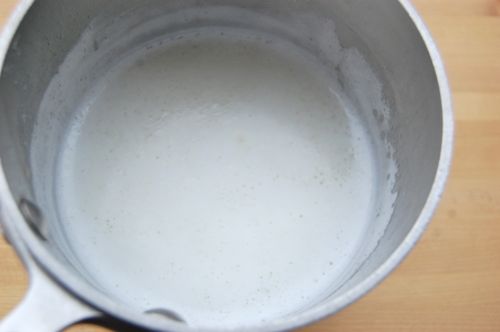 Stir or whisk that mess together until the starch is gluey and gelatinized. It will be quite thick. A wooden spoon would have been a better choice here. Allow this mixture to cool completely.