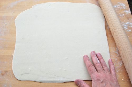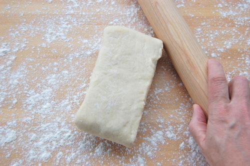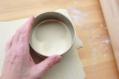 So preheat your oven to 475 degrees Fahrenheit and assemble your ingredients. Roll out about 1 1/2 pounds of puff pastry to make your crusts. Homemade pastry is what really makes these little pies shine. Use it if at all possible. Here’s I have a roughly 1 1/2 pound piece: