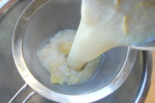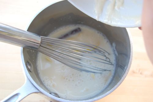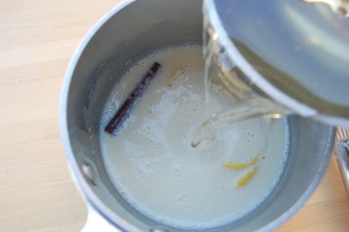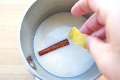 Next, combine the milk, vanilla, lemon peel and cinnamon stick in a small saucepan. Bring it to the boil.