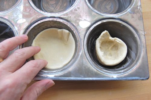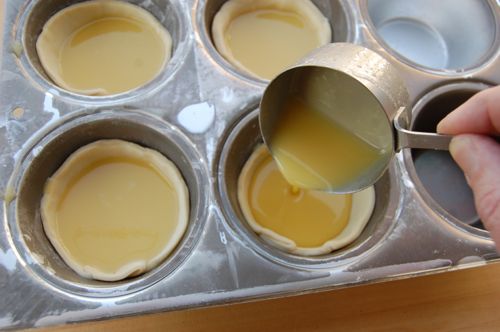 Take the pastry-lined forms out of the refrigerator and ladle in about 1/3 cup in each form. You want the filling to come only about three-quarters of the way up the sides of the pastry.
