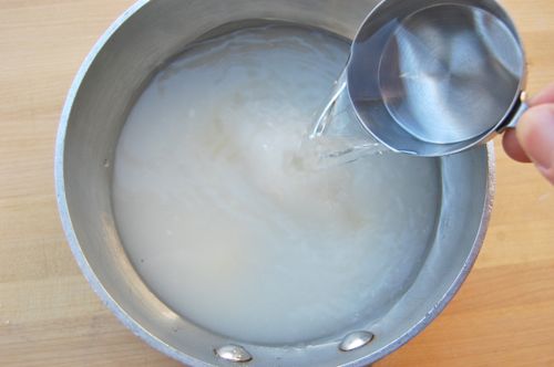 Combine your sugar and water in a small saucepan. Bring it to the boil and cook it to 220 degrees Fahrenheit. Remove it from the heat and allow it to cool completely before you move on.