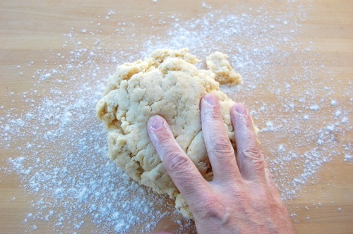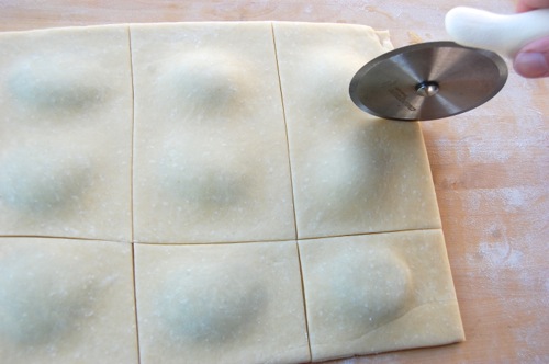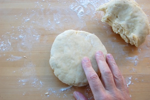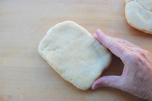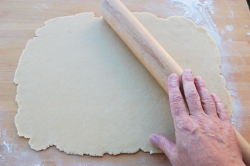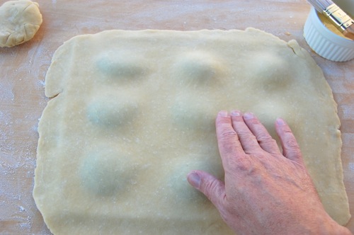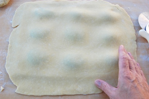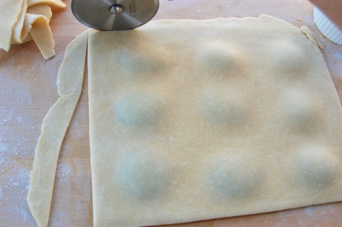 Cooled, the dough sheet is very manageable. You can just pick it up, set the bottom edge against the edge of the sheet on the board, and lay it down like a blanket. This dough isn’t as delicate as regular pie dough. You won’t have a problem. Or if you’d rather assemble them one-by-one as a warm-up, you can do that too. It really doesn’t take that much longer.