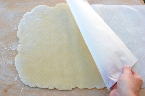 Me I prefer a little flour and the naked board. Roll the sheet gently into a large rectangle, about the size of a sheet of parchment..or to about 16″ x 12″. Rough edges are fine. Those of you who are afraid of pie crust, fear not this step. As I often say, pie crust isn’t meant to be rolled when it’s hard as a rock. When it’s cool or warm it’s as tame as a kitten. Go on, pet it.