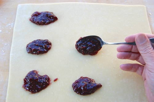 I prefer the latter because I don’t have to be as exact with the cutting. I don’t need a ruler, I can just size up the sheet, decide how many tarts I think I can get out of it, and start plopping down the filling. Since I trimmed this one a little small, and want my tarts to be about the same size as the commercial ones (3″ x 4″ or so), I’m going to shoot for nine. So…nine dollops of jam. Any kind is fine as long as it’s reasonably thick. Know what else is good? Nutella.