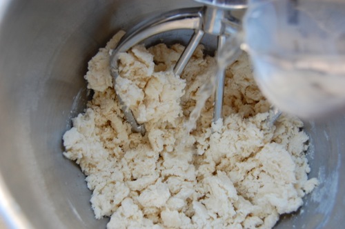Beat the mixture until it looks like coarse meal, about four minutes, then add the cold ice water.