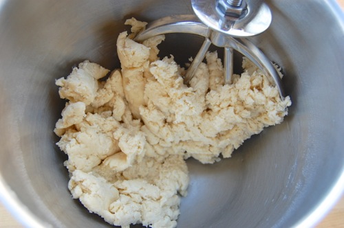 Turn the mixture back down to low and stir until a shaggy dough starts to come together. Mine was looking a little too dry, so I added another teaspoon of water and let it go around for a couple more turns.