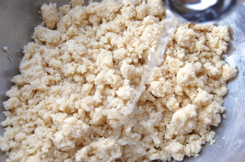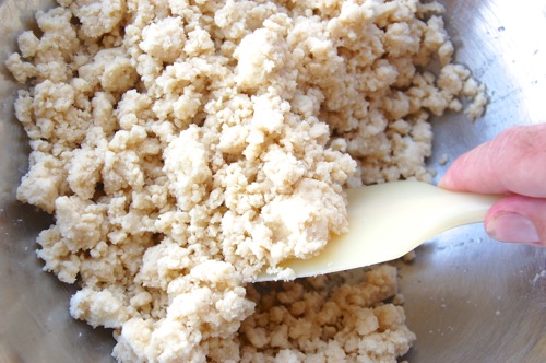 Add a few tablespoons and bring the dough together a bit with a spatula.