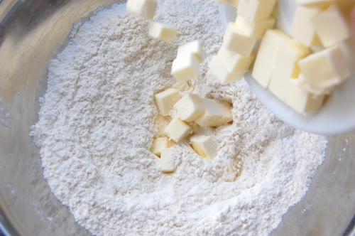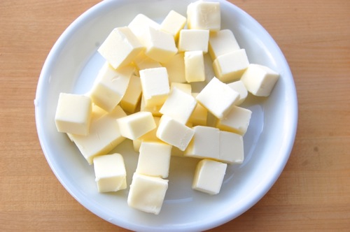 Cut the butter into small cubes and return them to the fridge or freezer.