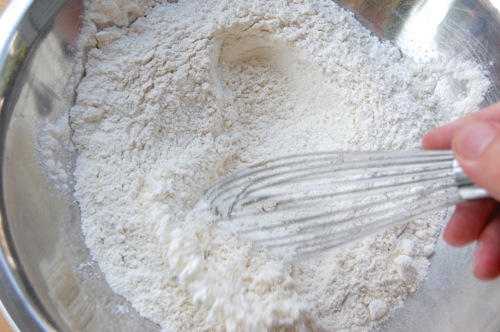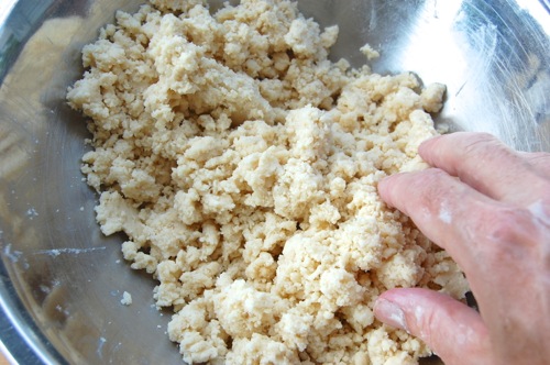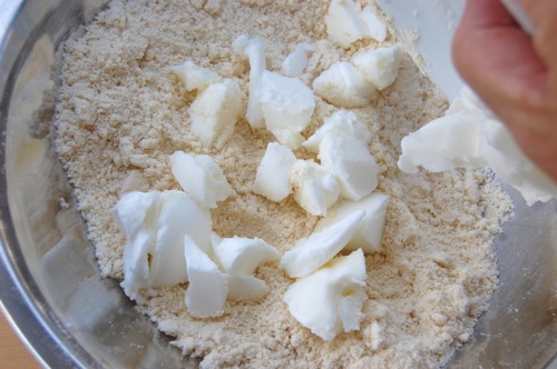 Quickly rub it in with your fingers or cut it in with a pastry blender. Then add the shortening/lard.