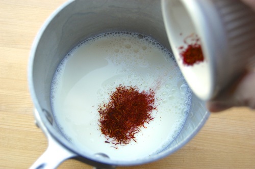 But that’s the sort of reaction these buns get. They’re fluffy and moist to the bite, exotic on the tongue and bewitching to the eye (they look like little flames to me). It’s a devastating combo. Plus you can make them start-to-finish in only a couple of hours. Oh yes, I’ll be making these again. Start by getting your ingredients together. Crush or grind the saffron as finely as you reasonably can. Add it to the milk and set the mixture on a low stove. Warm it and stir it but don’t simmer it. You just want to infuse the milk with all that lovely flavor and color. Set it aside to cool.