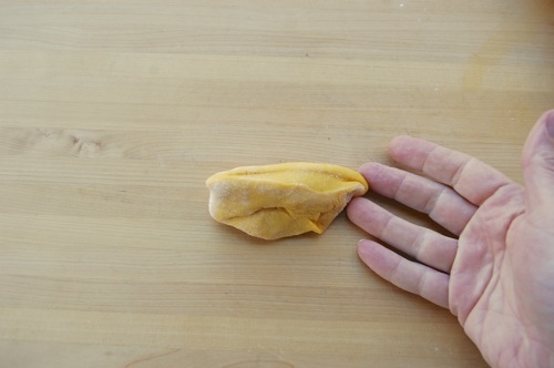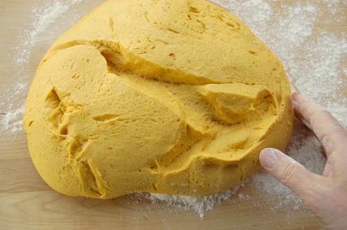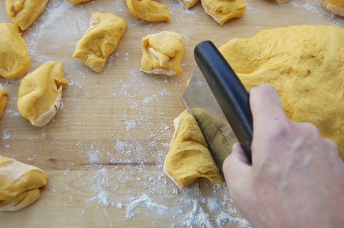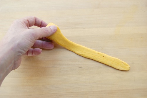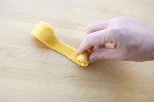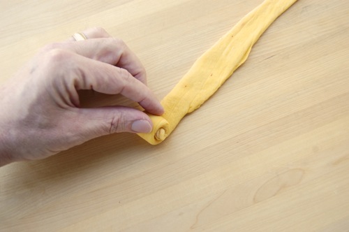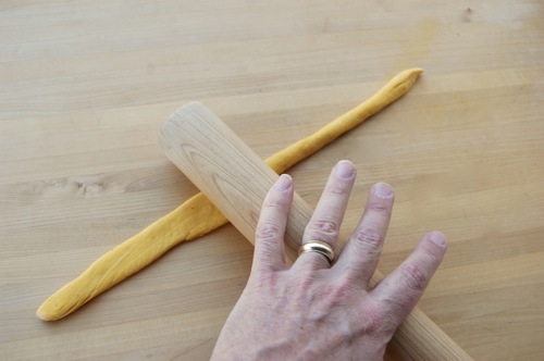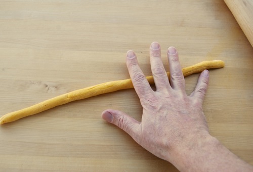 …roll it out with both hands into a snake 14-16 inches long. You won’t need much if any flour for this. In fact, so the snakes can grip the work surface, you may need to brush the board with a moist paper towel every so often.