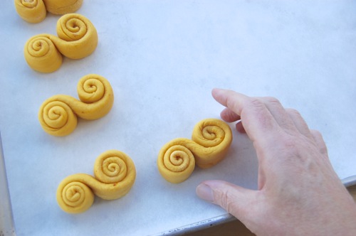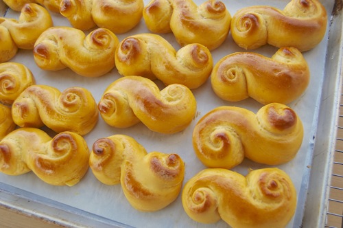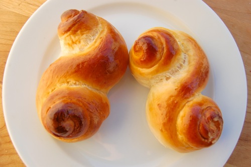 “Lucy cats” is another of their many names. With two little currant or raisin eyes on one end, they’d certainly be reminiscent of a cat with a fluffy curled up tail. Think? I took a big box of these to a party on Saturday and happened to be standing nearby when a woman blurted out “Somebody tell me which bakery these came from, because they’re the best rolls I’ve ever eaten!” I then had to pretend to be embarrassed as several people pointed over my way. Aw shucks, it was me. I was impossible to deal with for the rest of the evening, just ask the missus.