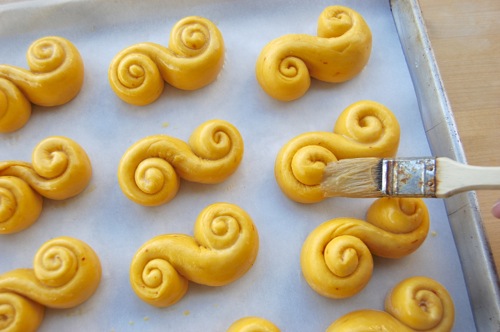 Let them proof for half an hour, brushing them with egg wash at about the fifteen minute mark, then right before you put them in the oven. You can dot them with currants or raisins at this point, which is traditional. I liked the curls so much I skipped that step.