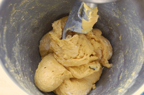 Once it comes together in a mass, switch to the dough hook.
