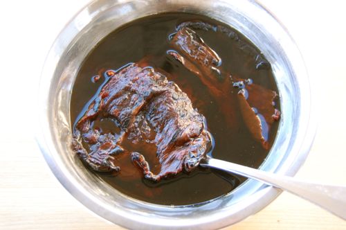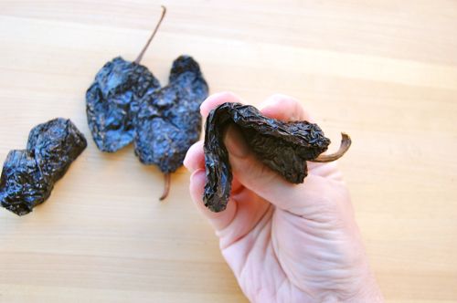 We modern foodie types are used to doing a lot of Continental cooking: French and Italian especially. So when we see a red or red-brown sauce we automatically assume there’s tomato in it. But in fact a lot of deep red and rust-colored Mexican sauces don’t have any tomato in them at all, just puréed chile pepper. Reconstituted dried chile pepper to be more exact.