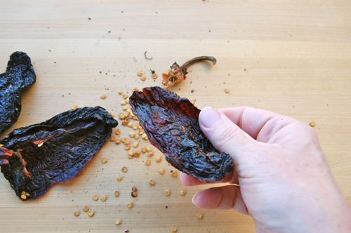 To begin processing them, tear them open. Just use your bare hands, they chiles won’t do anything to you. Tear off the stem and open the sucker up. You’ll find seeds inside. Shake them out.