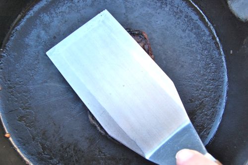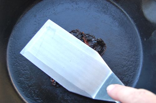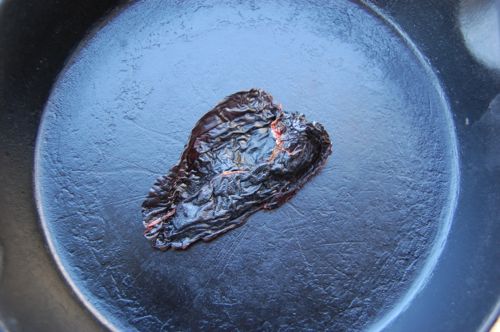 When they’re all seeded and torn up, heat up a skillet — cast iron is perfect for this — over medium-high heat. Lay a chile strip in. No oil or fat of any type is needed here.