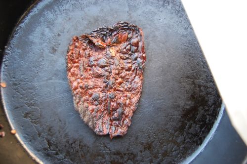 When you start to see the odd puff of smoke, flip the chile piece over. It should be orange-colored and blistered.