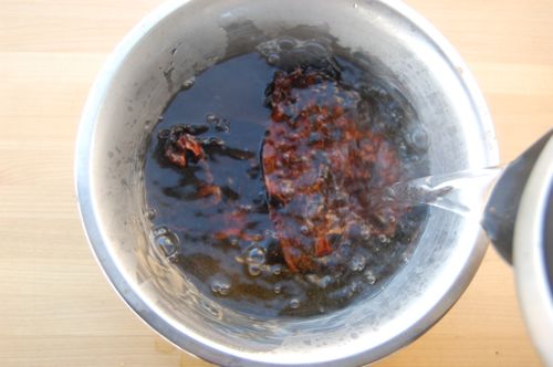 Place the chiles in a bowl and pour boiling water over them. If they float too much, weigh them down with a spoon, cup or saucer.
