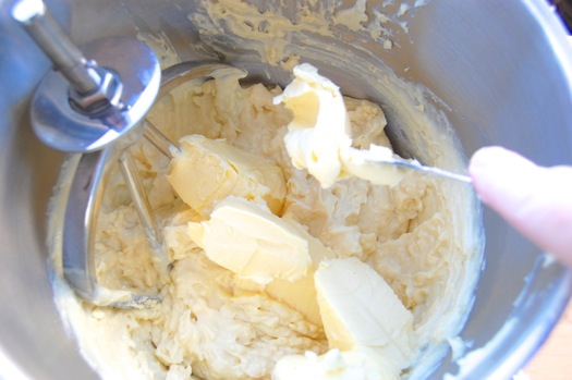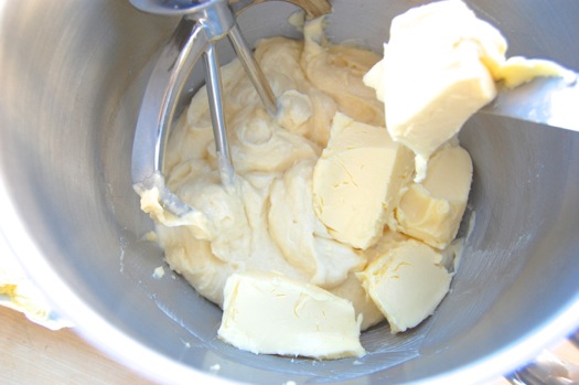 Here I am adding one cup of unsalted, cultured butter to 4 cups of pastry cream that I made with the full amount of sugar and twice the vanilla. I’m getting light-headed already.