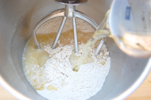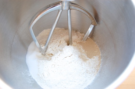 Now THIS is something I’m very excited about: homemade lavash. Wrap up some of your best sandwich fixin’s in some of this, straight from the oven, and get ready for the blank stares of wonder. In my universe lavash is the ultimate “wrap” bread, far preferable to tortillas, not only because it’s more flexible and tender, but because it’s larger and can more easily enclose…lots of stuff. Try this and you’ll probably never go back. Start by getting your ingredients together. Put the dry ingredients in the bowl of a stand mixer fitted with a paddle.