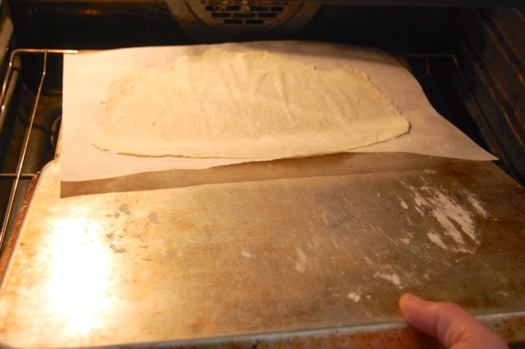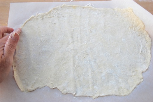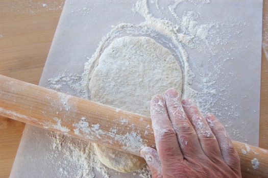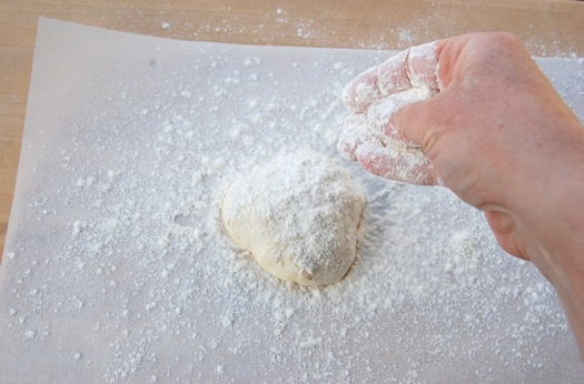 Pull off a piece, about an eighth of the mass, and apply it to a well-floured piece of parchment. Flour the dough, flour the pin, flour your hands, flour your brain if it’ll help…