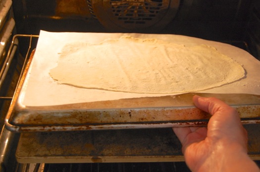 Roll a little, turn the sheet, roll a little more. Keep dusting the dough lightly as you roll, getting it as thin as you possibly can. This sheet isn’t as good as those little Armenian ladies made, but perfection isn’t required. Speaking of which, I decided in the end not to dock these (poke holes) or brush on oil or add seeds. You can do that, but to me this bread is perfect as it is.