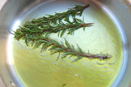 Pour the olive oil into a medium saucepan and heat it over medium-high heat until it shimmers in the pan. Add the rosemary and sauté about 30 seconds.