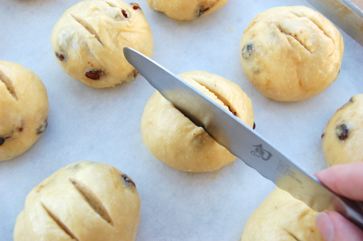 Let the buns rise another 30-45 minutes until they’re about doubled in size again and the dough still springs back a bit when you poke it. Meanwhile preheat your oven to 400 degrees Fahrenheit. When they’ve finished proofing score them in a tic-tac-toe pattern. I do one direction first…