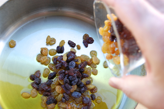Remove the rosemary from the (now flavored) oil and add the raisins to the pan. Sauté those another 30 seconds.