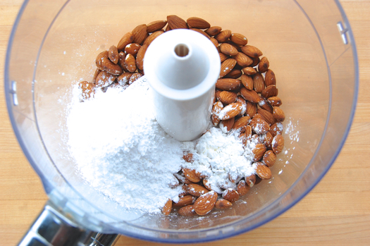 Begin by puliverizing the almonds. Combine them with the powdered sugar and the cornstarch (corn flour) in the bowl of a food processor.