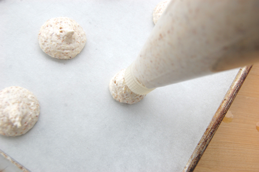 Load that into a pastry bag with the collar only and pipe blobs about an inch across. Keep the end of the collar about 3/4 inch off the surface of the sheet pan. You can use parchment like I’m using or simply grease a sheet pan.