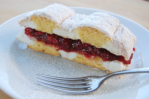 Here is what I’m told on good authority is a classic cardinal slice: two meringue-layfinger layers sandwiching raspberry jam. Of course because I can’t leave anything alone I stirred lots of fresh raspberries into the jam and spiked the whole mess with kirsch. Hello Vienna!