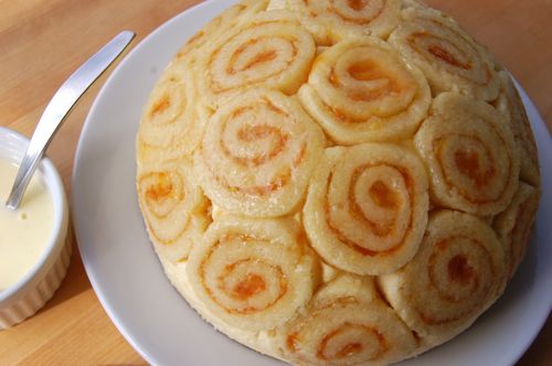 Just like a Charlotte russe, a Charlotte royale can take a variety of forms. This domed version is probably the classic, though I’ve seen lots of flat ones made in rounds as well. They can be just about any flavor. Mango is a true delight. It starts with a sheet of joconde, half as thick as my regular recipe calls for. It should be only lightly browned so that it remains flexible enough to roll. About like so: