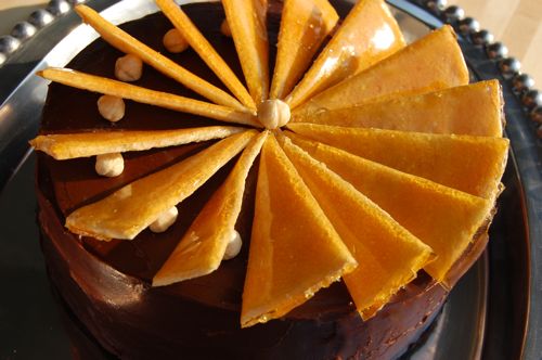 Ooh…ahh…are the kinds of noises people make when this torte arrives at the table. It’s a show-stopper of a presentation, particularly good for people like myself who stink at piping. And while those caramel-topped “fan blades” may look difficult to produce, they really aren’t provided you have an offset icing spatula, a chef’s knife and a little buttered parchment paper. But we’ll get to that.
